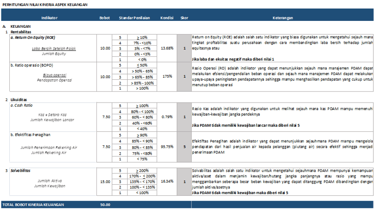 Tingkat keberhasilan pengelolaan PDAM diukur melalui proses penilaian terhadap kinerja PDAM yang didasarkan pada indikator kinerja penyelenggaraan pengembangan SPAM meliputi: aspek keuangan, operasional, pelayanan pelanggan dan sumber daya manusia sesuai dengan ketentuan di dalam Pasal 59 Permen PU No. 18/PRT/M/2007.