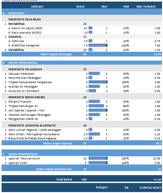 Tingkat Kesehatan BUMD ditetapkan berdasarkan penilaian terhadap kinerja Perusahaan untuk tahun buku yang bersangkutan yang meliputi penilaian: