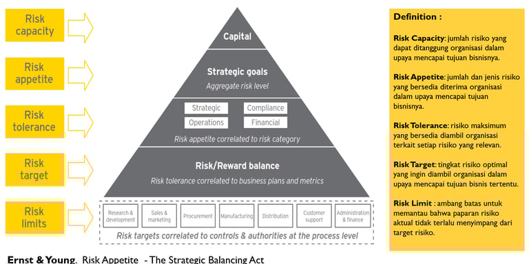 Risk Appetite didefinisikan sebagai jumlah dan jenis risiko yang bersedia diterima organisasi dalam upaya mencapai tujuan bisnisnya (stakeholder objectice).